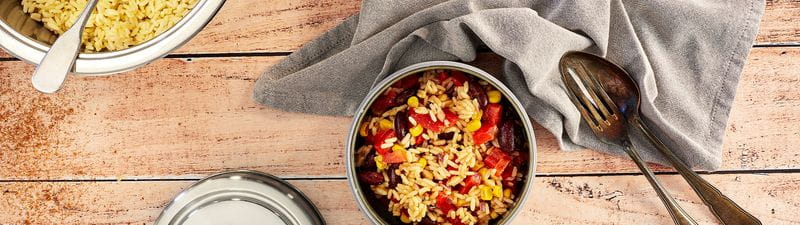 - Dodamo riž, koruzo in fižol ter premešamo. Začinimo s soljo in poprom po okusu.