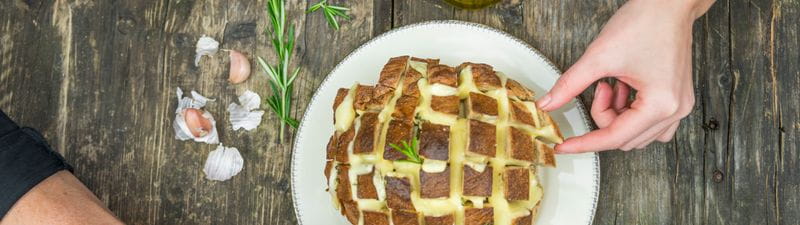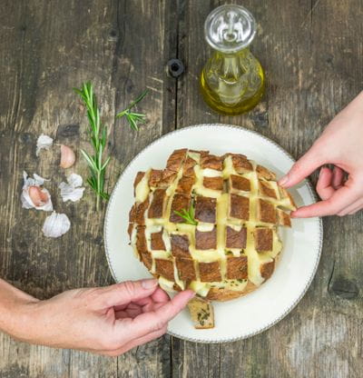 - Remplir d'huile à l'ail les espaces apparus lors de la découpe du pain. Couper le fromage en lanière et l'insérer de la même façon dans le pain.
