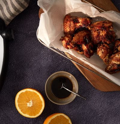 - Presser l'orange, mélanger le jus avec l'huile, le miel, la sauce soja et environ 1/2 cuillère à café de sel. Effeuiller l'estragon, le hacher finement et l'incorporer à la marinade avec les ailes de poulet. Couvrir et laisser mariner pendant environ 2 heures.
