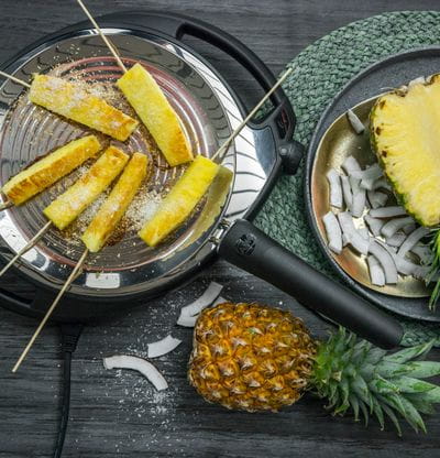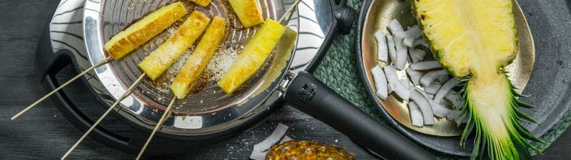 - Chauffer l‘oPan à chaleur maximale jusqu‘à atteindre la températureidéale pour rôtir.Réduire le feu à basse chaleur, disposer les ananas dans l‘oPan et les rôtir sur les deux faces jusqu‘à obtenir la cuisson souhaitée.