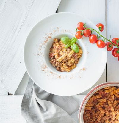 Selon vos goûts, accompagner les pâtes avec un peu plus de légumes (par exemple une carotte finement coupée en dés et 1 ou 2 tiges de céleri finement coupé en dés)