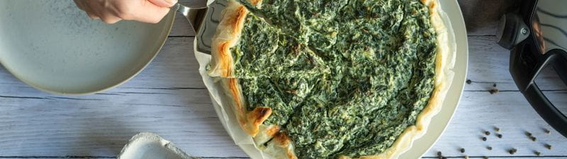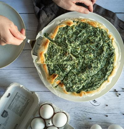 - Pustite kolač od špinata da se po isteku vremena pečenja malo ohladi, odvojite ga nožem od ruba i izvadite ga iz posude na tanjur za posluživanje.