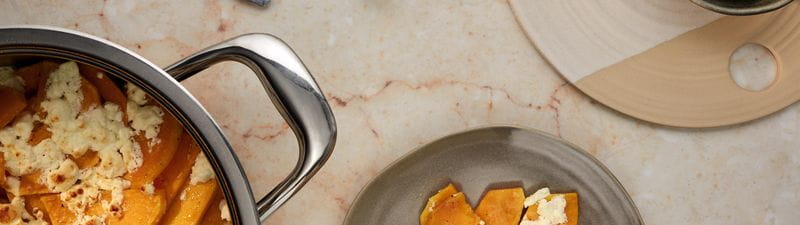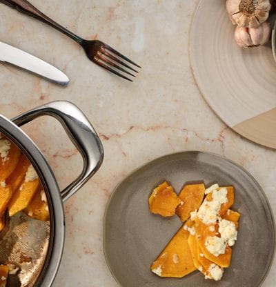 - Bundevu prepolovite, očistite od sjemenki i narežite ju na tanke ploške. Češnjak oljuštite i nasjeckajte. Feta sir narežite na kockice.