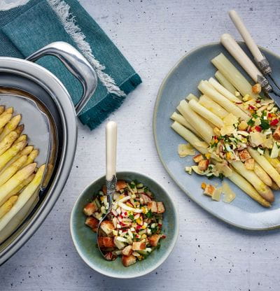 - Po isteku vremena kuhanja maknite Oval EasyQuick, izvadite ovalni umetak, šparoge posložite na tanjur za posluživanje.