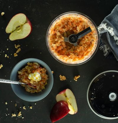 - Schil en snijd wortelen in grote stukken. Was, snijd de appel en verwijder het klokhuis. Maak de bleekselderij schoon en snijd ook in grote stukken. Hak alles geleidelijk fijn in de Quick Cut, roer het citroensap erdoor.