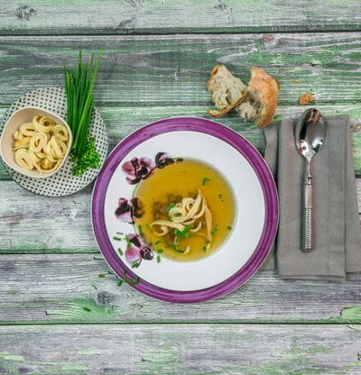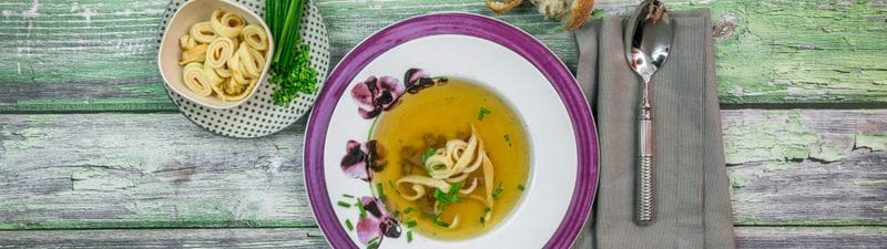 - Snijd de bieslook in ringen, voeg ze toe aan de soep met het vleesblokjes en de pannenkoekenreepjes.