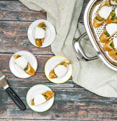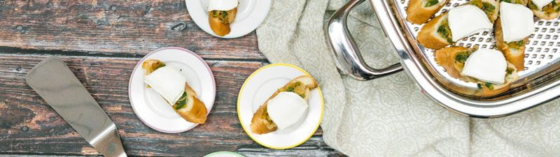 - Draai de sneetjes om, verdeel de uienmengeling erover en leg op elk een stukje kaas. Schakel de kookplaat uit, leg het deksel erop en bak de crostini ca. 3 minuten tot de kaas begint te smelten.