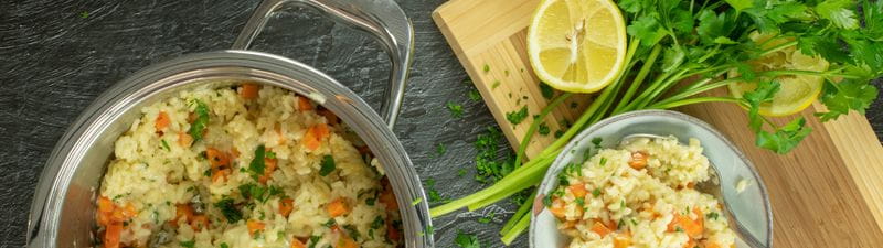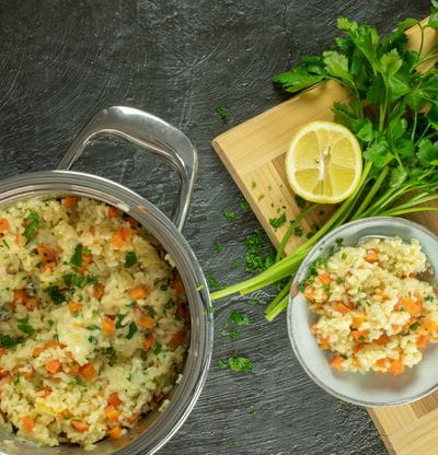 - Verwarm de kookpot op de hoogste stand tot het braadvenster wordt bereikt. Schakel vervolgens over naar een lage stand, voeg de rijst toe en laat ze allebei aanbruinen. Voeg de worteltjes toe en blus met vermout.