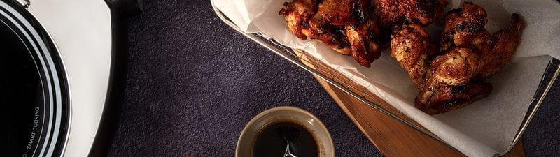 - Zet de pan op de Navigenio en verwarm op stand 6 tot het braadvenster wordt bereikt. Laat de vleugels een beetje uitlekken. Schakel de Navigenio uit en leg de vleugels met het vel naar boven erin. Bak tot het omdraaipunt bereikt is.