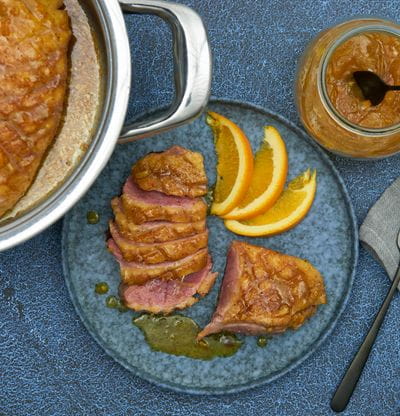 - Meng de sinaasappeljam met olijfolie en breng op smaak met een beetje zout en peper.