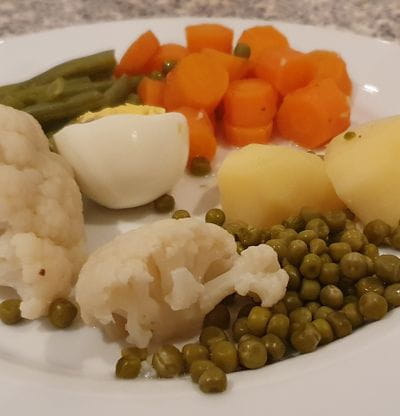 - Doe de groenten, aardapplen en eventueel een ei druipnat in de 20 cm 3,0 L, zet het deksel erop.