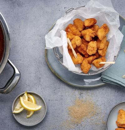 - Haal de deksel eraf en draai de nuggets om en bak ze goudbruin zonder deksel. Haal ze eruit en laat ze uitlekken op keukenpapier. Bak de resterende stukken kip op dezelfde manier, verhoog zonodig de stand van de kookplaat.