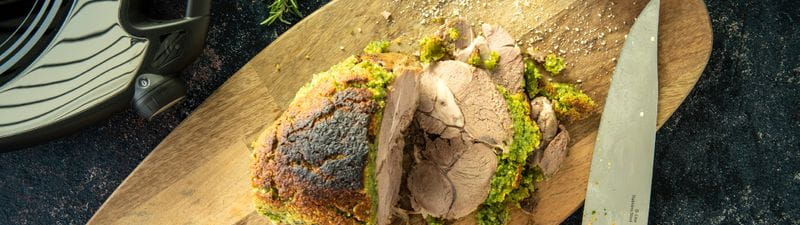 - Pel en snipper de knoflook. Verkruimel het toastbrood, pluk de peterselieblaadjes en de rest van de tijm- en rozemarijnblaadjes en hak ze grof. Mix met de amandelen, de Parmezaanse kaas en de olijfolie en breng op smaak met peper en zout. Rol het kruidenmengsel uit tussen vershoudfolie ter grootte van de lamsvlees en leg het in de koelkast.