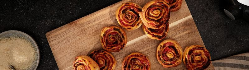 - Rol het bladerdeeg gelijkmatig en strak op. Snij vervolgens in plakjes van ± 1,5 cm dik.