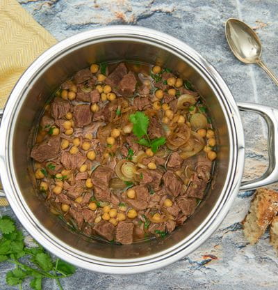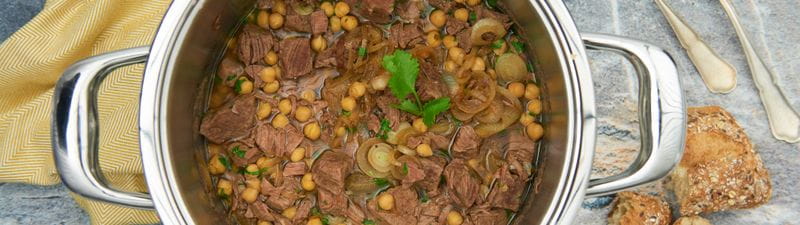 Stoofvlees met kikkererwten en gebakken uien