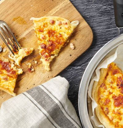- Cestový korpus s papierom na pečenie vložte do panvice a nahusto ho popichajte vidličkou. Panvicu postavte na sporák, zapnite na najvyšší stupeň, nasaďte Navigenio v preklopenej polohe, zapnite na najvyšší stupeň a cca 3 minúty predpečte (v prípade indukčného sporáka len cca 2 minúty).