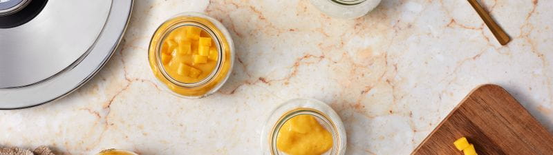 - Kokosový puding rozdeľte do pohárov, pridajte mangový krém a nakoniec kocky manga. Nechajte dôkladne vychladiť v chladničke aspoň 2 hodiny.