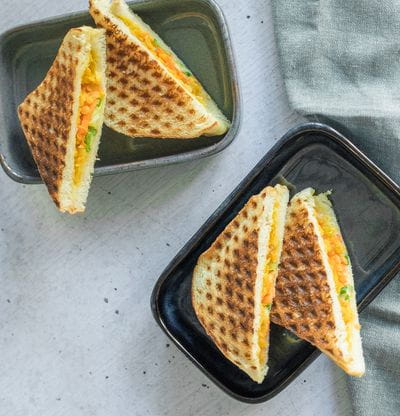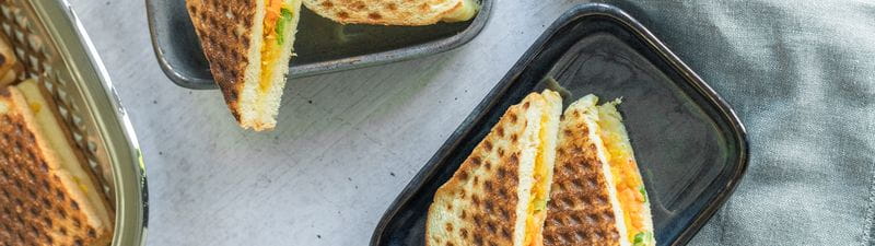 - Šošovicu rozložte na polovicu plátkov toastového chleba a navrch uložte jarnú cibuľku, nastrúhanú mrkvu a plátky syra. Prikryte zvyšnými plátkami toastového chleba a trochu pritlačte.