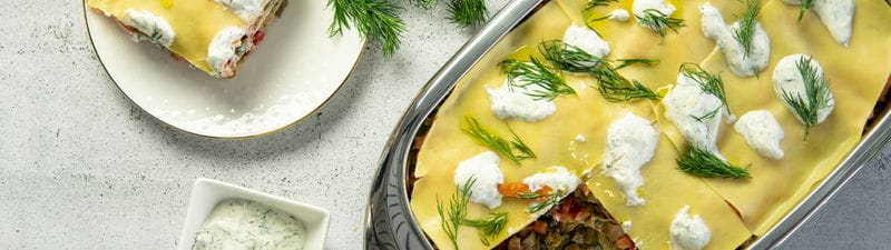 Jogurtova omaka s koprom se k tej hladni lazanji odlično poda.