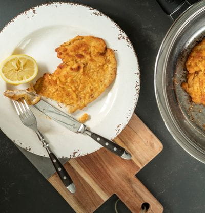 - Moko in drobtine nasujemo v posamezna krožnika. Jajce razžvrkljamo v globokem krožniku. Posamezen zrezek najprej z vseh strani povaljamo v moki, nato v jajcih in naposled v drobtinah. Odvečno panado lahko zavržemo, ali pa še bolje iz nje naredimo manjše ocvrtke..