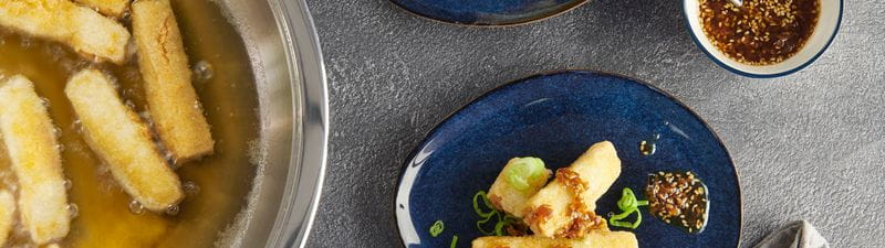 - Palčke tofuja ocvremo in jih pri tem obračamo, dokler ne dobijo zlatorumene barve. Nato jih odstranimo iz olja in pustimo, da se odcedijo na kuhinjskem papirju. Preostale palčke tofuja ocvremo na enak način.